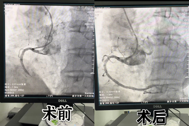 急性心肌梗死是心血管内科一个常见疾病,但同样也是心内科的急危重症。立即和家属进行沟通取得同意后,杨涛主任、郑明修副主任、睢国鑫医生立即为患者开辟绿色通道行急诊手术,术中冠状动脉造影提示:右冠中段100%闭塞,与家属沟通获得同意后行支架植入术,开通右冠,心电图ST段明显回落,患者胸闷症状也较前明显好转,术后安返病房。